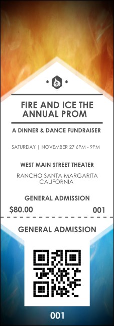 Create hot promotions for your cool event! The Fire and Ice Event Ticket features vivid blue and orange colors, with event details listed on a white background. Add an extra level of security at the door with the easily scanned QR code on the ticket stub.