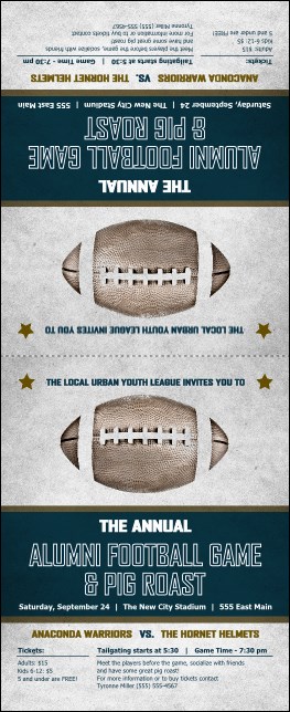 Tackle game promotions with the Football Blue Table Tent! Captained by a bronze football, this template highlights seventeen lines of your event’s details in <g data-gr-id="21">standout</g> athletic text. Custom printed in vivid color on top quality card stock.