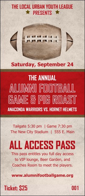Don’t make your VIPs rush to get the best seats! Give them the special treatment when you print Football Red VIP Passes for your sports event. With room on the template to customize fifteen lines of text with all your game details, and a throwback design that includes a bright red stripe, these Passes will put you on the route to great event organization.