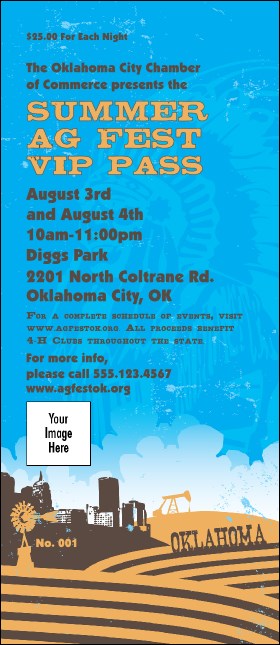 If you're planning something extra special for your next local event, consider the Oklahoma VIP Pass. This memorable pass template is printed with a big blue sky, golden fields of wheat and the image of a city skyline. Each is individually numbered for your event's security.